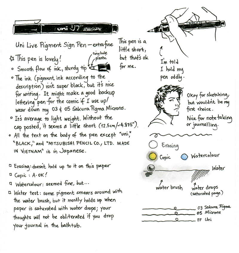The Uni Live Pigment Sign Pen in Extra Fine is currently only US$1.65 on Jetpens. I don’t know the pen’s longevity yet, but it’s a good pen for the price—for writing, not for comic-drawing.