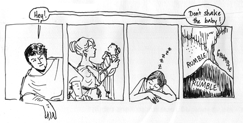 Update: Here’s a little scribble made during a recent lunchtime at work. One thing I really don’t do much of in the comic is heavy shadows, so I thought I’d see how quickly I could recreate a panel from a comic that is almost all heavy shadows.