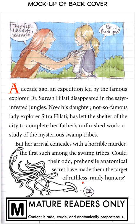 Click on the image to see a mock-up of the back cover, with descriptive copy, proposed illustration, content warning, Surgeon General’s notice, and an octopus in a squid suit.