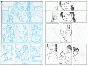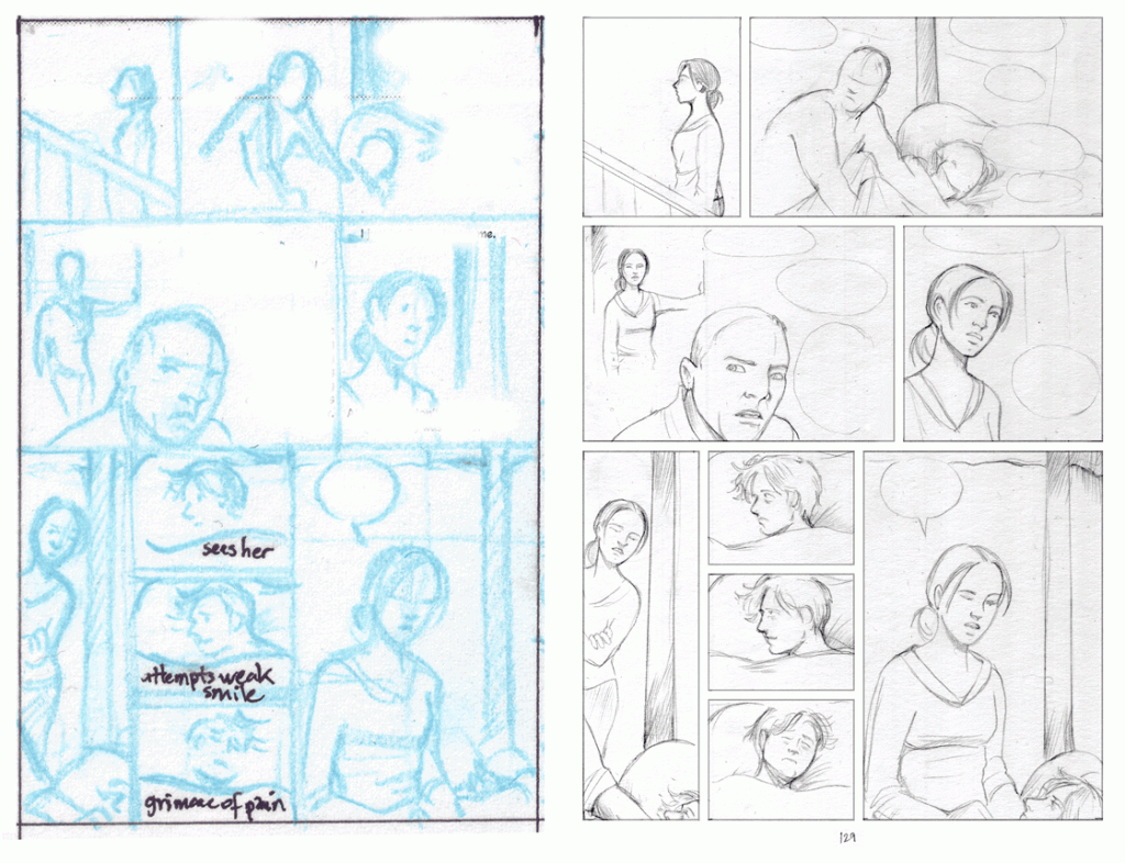 To produce pages faster, I was experimenting with going directly from very loose thumbnails to detailed inks. Here’s a page in progress. I would have fixed some parts of this if it were going to be final art.