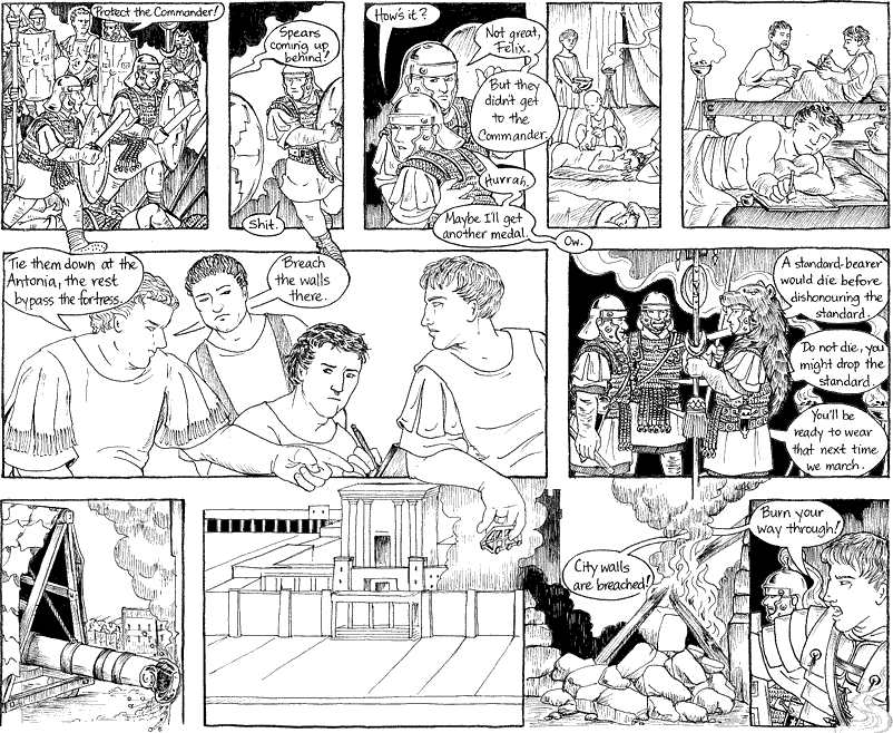 In addition to trying to bring down a city's walls with battering rams, Roman legions might build a wooden structure higher than the battlements, which would then be ignited and collapsed down over the fortifications. This, of course, required a good supply of wood, and also a flammable city. Many cities obliged by burning quite dramatically.