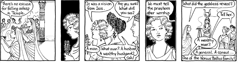 The sistrum is an instrument used by the Romans (and others) in the worship of Isis, shaken like a rattle. I drew Iusta's with three bars, but it is also depicted with four, and usually with a looped top reminiscent of an ankh, but there are variations on the design. The sound of the sistrum attracts the attention of the gods, placates them, and drives away malicious creatures. Egyptians in earlier times associated the instrument with the goddess Hathor before also assigning it to Isis. Some sources say the sistrum might have evolved from shaking bundles of papyrus flowersan origin explanation I quite like.