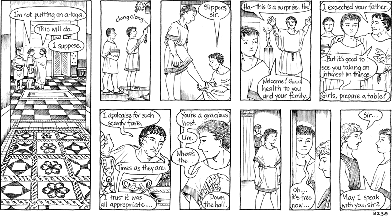 Traditional Roman mansions had a layout of foyer (fauces"throat") leading to the open-to-sky atrium, leading to the tablinum, a sort of office/reception room. There might also be little rooms (alae, "wings") off the atrium or tablinum, and a nook or sleeping space for the doorman. These were the public areas of the house; anything beyond this (bedrooms, garden, dining room), though they might specifically be designed to be visible from the front of the house to show off paintings or mosaics or statuary, were considered private. Only family and good friends were allowed therein.