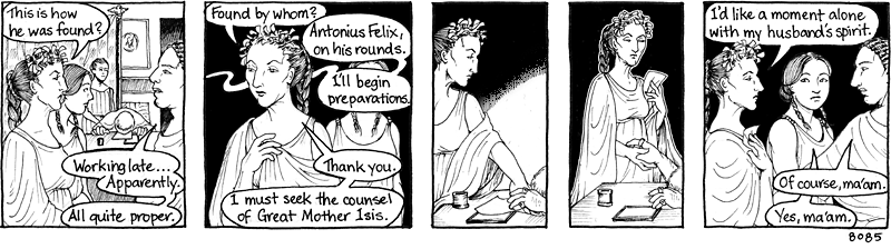 Over this weekend coming I will be creating a message forum on Comic Genesis for discussion of the older comics and past storylines (so you don't have to hunt for the right post on LiveJournal to make a comment) and as a repository of odd Roman facts and oddly colured Roman comics. I also have an additional (odd) idea inspired by another webcomic, to be called Picnic by the Styx and... let's wait and see if I can get the forum up and running, and then we'll see how it all goes.